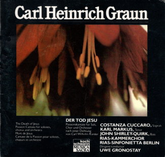 KOCH 313081 K1<収録曲> Carl Heinrich Graun/Der Tod Jesu グラウンによる受難オラトリオ「イエスの死」です。この曲はベルリン王立オペラ座での初演以来大変な人気を誇り、1884年に至るまで毎年聖金曜日にベルリンのみならずドイツ各地で演奏され続けました。カトリックが優勢であった南ドイツでも演奏されており、18世紀後半から19世紀前半のドイツで最も頻繁に演奏された受難音楽ともいわれています。 カール・ハインリヒ・グラウン(1703/04〜1759)は、ドレスデン近郊のヴァーレンブリュックという町で生まれています。長兄のアウグスト・フリードリヒ・グラウン(1698/99〜1765)、 次兄のヨハン・ゴットリープ(1701/02〜1771)もあわせたグラウン三兄弟はいずれも当時著名な音楽家でした。長兄はメルゼブルクの宮廷楽長を務めた以外細かいことがわかっていませんが、下の二人は少年期に兄弟揃ってドレスデンの聖十字架教会の合唱隊に所属していました。次兄はその後ヴァイオリニストとしてメルゼブルクの宮廷楽団に入り、プロイセン皇太子フリードリヒ(のちの大王)の私設楽団に移って、フリードリヒが王位を継いでそのまま宮廷楽団となった後には楽師長に昇進して生涯その地位を保ちます。楽団はその後フルートのクヴァンツやチェンバロのエマヌエル・バッハ、歌手として末弟カール・ハインリヒを迎え入れることになります。 末弟はライプツィヒ大学で学んだ後ヴォルフェンビュッテルでテノール歌手として音楽家のキャリアをスタートさせ、フリードリヒの楽団に移ったのは1735年です。1740年に王が即位して正式に宮廷楽団が発足したとき、楽長になったのは次兄でなく弟の方でした。次兄の作品はシンフォニアやコンチェルトや室内楽の作品が多く、弟は教会作品やオペラが多いのは専門分野の違いから当然かと思いますが、それぞれ相手の分野の音楽も作っていて最近では作者が入れ替わることもあるようです。作風はどちらもドレスデンで培ったイタリア風のもので、シンプルに明るく美しく歌わせます。 フリードリヒ即位翌年の1741年夏には王の肝煎りでウンター・デン・リンデンにオペラ座の建設が始まるので、おそらくはその前年までにはすでに構想があり、オペラも作れて差配もできる弟の方が楽長にふさわしかったのかもしれません。1740年には、亡くなったばかりの先王フリードリヒ・ヴィルヘルムの葬送音楽を書いたり、その年のうちに新王の命で新しいオペラ歌手を楽団に雇い入れるためにスカウトの旅に出て一年間イタリアに滞在しています。 このオラトリオは、ベルリンの詩人カール・ヴィルヘルム・ラムラーの台本に基づいて1755年に作曲・上演されたものです。すぐに大評判となって人気が長く続いたのは上述の通りです。全25曲で二部に分かれており、一部と二部の間にはおそらく説教があったはず。歌詞は自由詩によるアリアとレシタティーヴォが主で、テノール=福音史家とかバス=イエスといった特定の役割分担はありません。受難曲で歌われた聖句は、少し形を変えて各声部で間接的に引用されています。25曲のうちコラールと題された曲が6つありますが、聞いてみてプロテスタントのコラール原曲がすぐわかったのはとりあえず4つです。歌詞も本歌のコラールが使われている曲もありますが、冒頭の「Du dessen Augen flossen(涙を流した)」はバッハも使った有名な受難コラール「血潮したたる」の旋律が当てられているもののこの歌詞はパウル・ゲルハルトのオリジナルの10節の中には入っていない自由詩です。第二部冒頭の「Ich werde dir zu Ehren alles Wagen(あなたの栄誉のためにすべてを捧げます)」はこちらもバッハも使ったヨハン・へールマンの受難コラール「心より慕いまつるイエス」の第9節と第11節の歌詞が当てられ、旋律もバッハと同じもの。この二つは受難コラールなのでまだわかりますが、第11曲はクリスマスオラトリオに使ったゲルハルトの降誕のコラール「私は飼葉桶のそばに立つ」の旋律とオリジナルにない自由詩の歌詞、第21曲はフィリップ・ニコライの降誕のコラール「暁の明星のいと美しきかな」の旋律と自由詩というふうに、必ずしも受難一色ではありません。バッハもクリスマスオラトリオにあえて受難のコラールを使ったりしてはいますが、受難の中に降誕が歌われるのはよく理解できていません。 これらのコラールは比較的シンプルな4声体に編曲されていますが、アリアやレシタティーヴォはやはりギャラント様式で美しく、あまり激しい表現はありません。第一部の終わり頃に出てくる合唱フーガはヘンデルもかくやという対位法を駆使した曲ですが、その他は和声的というかコラールの使い方にも現れている通り全体的に情感豊かに歌い上げるというスタイルです。グラウンにとっては受難は厳しいものや痛みを分かち合うものではなかったようです。 演奏は、ウヴェ・グロノスタイ指揮のRIAS室内合唱団とRIASシンフォニエッタ・ベルリンです。グロノスタイは1972