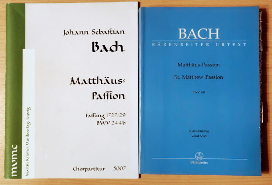 | ヨハネ受難曲と並ぶ、バッハのもう一つの真作であるマタイ受難曲BWV244は、二群のオーケストラと合唱を持つ規模の大きな作品です。ヨハネ福音書がイエスを超越者・絶対者のように描いていて弟子との会話も一方的にみえるのに対し、マタイ福音書では苦悩も垣間見せて弟子とも普通に会話するなど、少し距離が近く感じられます。それを題材とするそれぞれの受難曲もその性格を生かして、ヨハネでは非常に厳しい音楽が付されていますがマタイではところどころに柔らかくまた息をのむほどに美しい旋律が書かれていたりします。 マタイ受難曲は、最近では1727年に初演されたというジョシュア・リフキンの説がすっかり定着していて、1729年に再演、1736年に改訂された後期稿による演奏、さらに1742年頃にも少しの改訂を加えて演奏されたということでほぼ見解も一致していて、今のところ新しい議論の余地は残っていないようです。マタイ受難曲はヨハネほど複雑な改訂を経ておらず、これまでは特に1736年の再演のために準備された後期稿、即ちバッハ本人の自筆清書総譜が決定版とされてきました。新バッハ全集でもBWV244としてこの稿が出版され、長く使われてきています。 作曲譜が失われてしまっているため1727年の初演時の状態ははっきりとはわかっていないのですが、後になって作成された筆写総譜の一つがそれに近い状態をとどめていると推定されています。この手稿は1736年にバッハが行った改訂を反映していないため、当初バッハの高弟で娘婿、ナウムブルクの聖ヴェンツェル教会でオルガニストを務めたヨハン・クリストフ・アルトニコル(1719〜1759)が1740年代にバッハに直接師事していた頃に、後期稿ができた後は使われなくなった古い総譜を勉強のため借り出して筆写したとされてきました。しかしその後の研究でそこに見られるものと同じ筆跡がアルトニコルの没後の書類にも発見され、再検証の結果この手稿はアルトニコルの弟子、バッハの孫弟子であったヨハン・クリストフ・ファールラウによって書かれたものであるとされました。ファールラウについては生没年を初め経歴の細かいことはわかっていませんが、1735年頃に生まれ、1750年にナウムブルクの学校に入学して、おそらくその頃にアルトニコルの弟子になったと想定されます。二人の筆跡は前世紀中は区別が付かなかったほど似ていて、これは勉強の過程で字が師匠に似ていったと考えるのが自然です。他にもこれまでアルトニコルの手になるとされていた手稿譜のいくつかは、アルトニコルの未亡人であるバッハの長女がライプツィヒの実家に戻った後の1760年代に、ファールラウがライプツィヒを訪れてそこで作られたものと考えられています。 マタイ初期稿には、推敲の手が入った後期稿と比べ若干ですがシンプルな別の味わいがあります。初期稿はBWV244bの番号が振られ、前世紀の末まではファクシミリ版しか出版されていなかったので、気軽に音にできない状態が続いていました。しかし1997年頃にライプツィヒのマルティン・クレーマー社から演奏譜が出版され、今世紀になってこの初期稿を使った録音もいくつか出てきて、一定の市民権も得てきたようです。 私が所属している明治学院バッハ・アカデミーも2002年に初期稿を用いた演奏会を行い、ライブ録音をCD化しました。これが出してみたら世界初録音だったようです。初期稿の演奏自体はトマス教会のカントルであったゲオルク・クリストフ・ビラーが2000年に行っているので世界初演ではありませんでした。この時に合唱団が使ったクレーマー社の楽譜(写真上の左側、右は最もよく使われるベーレンライター社のピアノ伴奏ヴォーカルスコア)は声楽パート譜で、合唱部分と入りの目安となるソロやオケの一部が書かれたものです。日本では合唱譜と言えばピアノ伴奏譜が主流ですが海外ではこの形もよくあるようです。 初期稿と後期稿の違いを、ここでざっとまとめてみます。興味を持たれた方は、ぜひ礒山雅先生の「マタイ受難曲」や上記初期稿の演奏会の詳細が書かれた樋口先生の「バッハから広がる世界」(春秋社)にあたって頂くことをお勧めします。ただし礒山先生の本は初版が1994年で初期稿はまだアルトニコル筆写譜とされています。ファールラウの名前が出てくるのは2002年のことで、そのあたりの事情も樋口先生の本に書かれています。 現在では、美しいバッハ自筆の後期稿だけでなく初期稿も画像データが公開され、我々のような一般の愛好家でも直接見ることができるようになってきました。下記以外にも細かい違いは結構あってとても全部は書ききれないので、実際のバッハやファールラウの書いたものを追いかけてもらうのが良いかと思います。 バッハが改訂作業を実施するに当たっては、基本的に作曲譜を一旦書き写してその上に改訂を加えていったところがたくさんあります。このあたりはきれいに整えられて出版された実用譜ではわからないことで